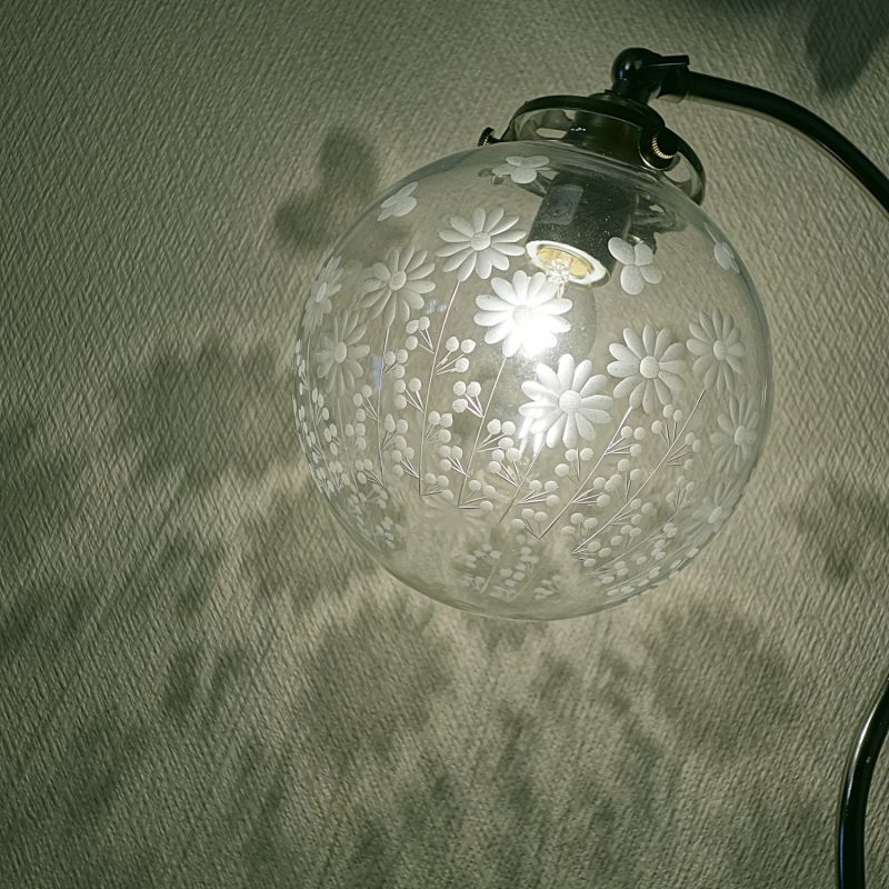すっきりしたデザインの落ち着いた雰囲気のスタンド器具と切子の繊細な模様がよく合っています。