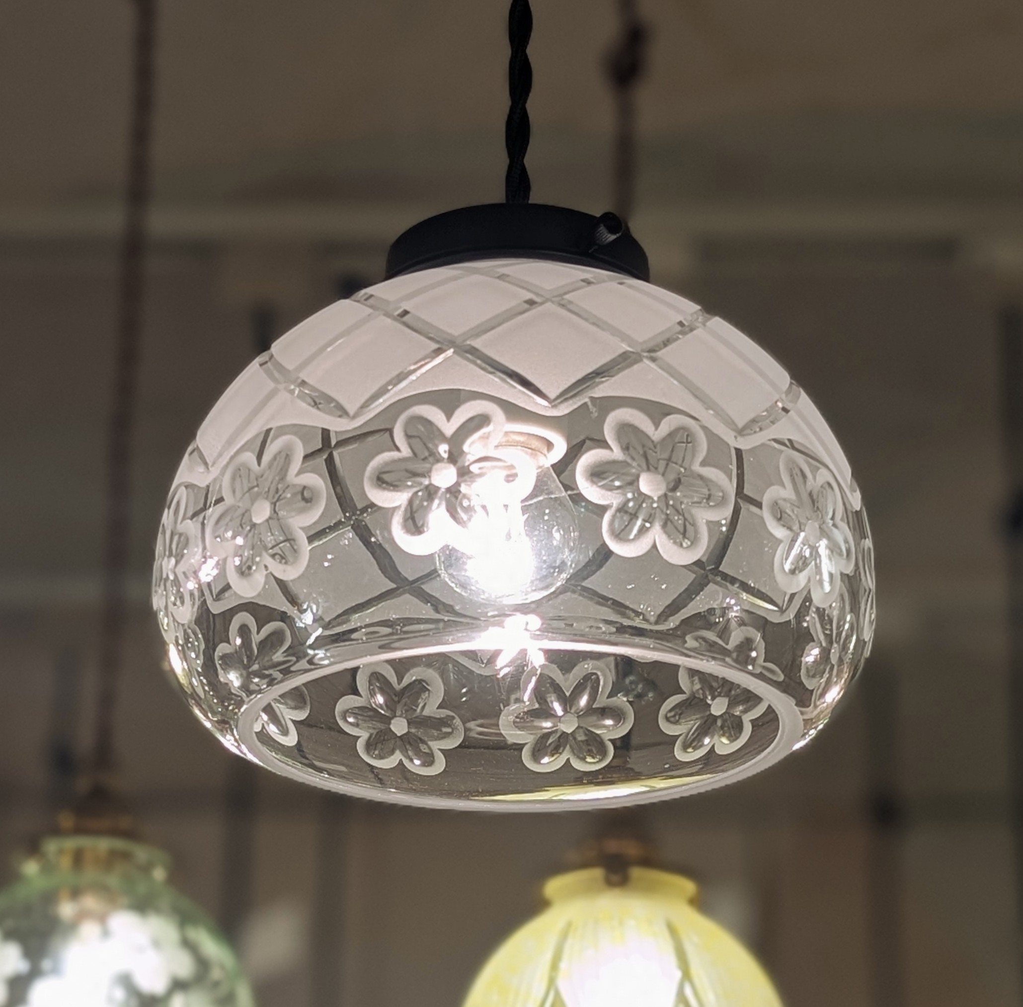 すりガラスの矢来切子の下にかわいい花模様のランプ。上部がすりガラスなのでまぶしさも少なく やさしい灯りです。