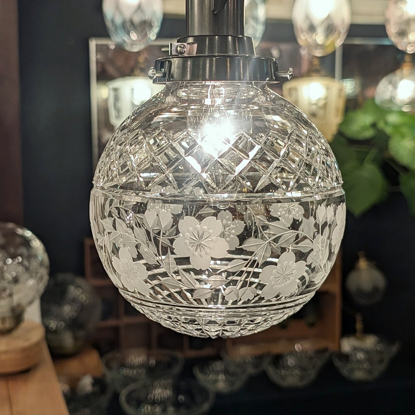 厚みのあるガラスの上部に伝統的な矢来模様 真ん中に華やかな桜の柄 底にも深く模様を入れた大変凝った模様です。キラキラと反射する矢来切子と桜の花が宝物にしたくなるようなランプです。
