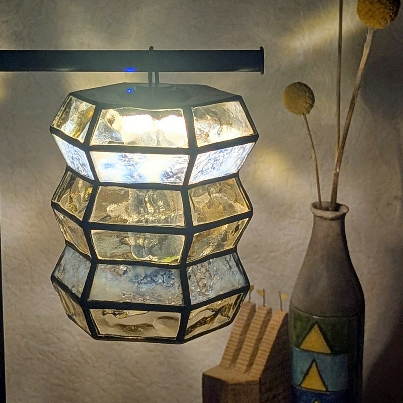 波打つ影を映すアンバーガラスと白が混ざったクリアガラスの組み合わせ。面の多いステンドグラスならではの光が空間を彩ります。