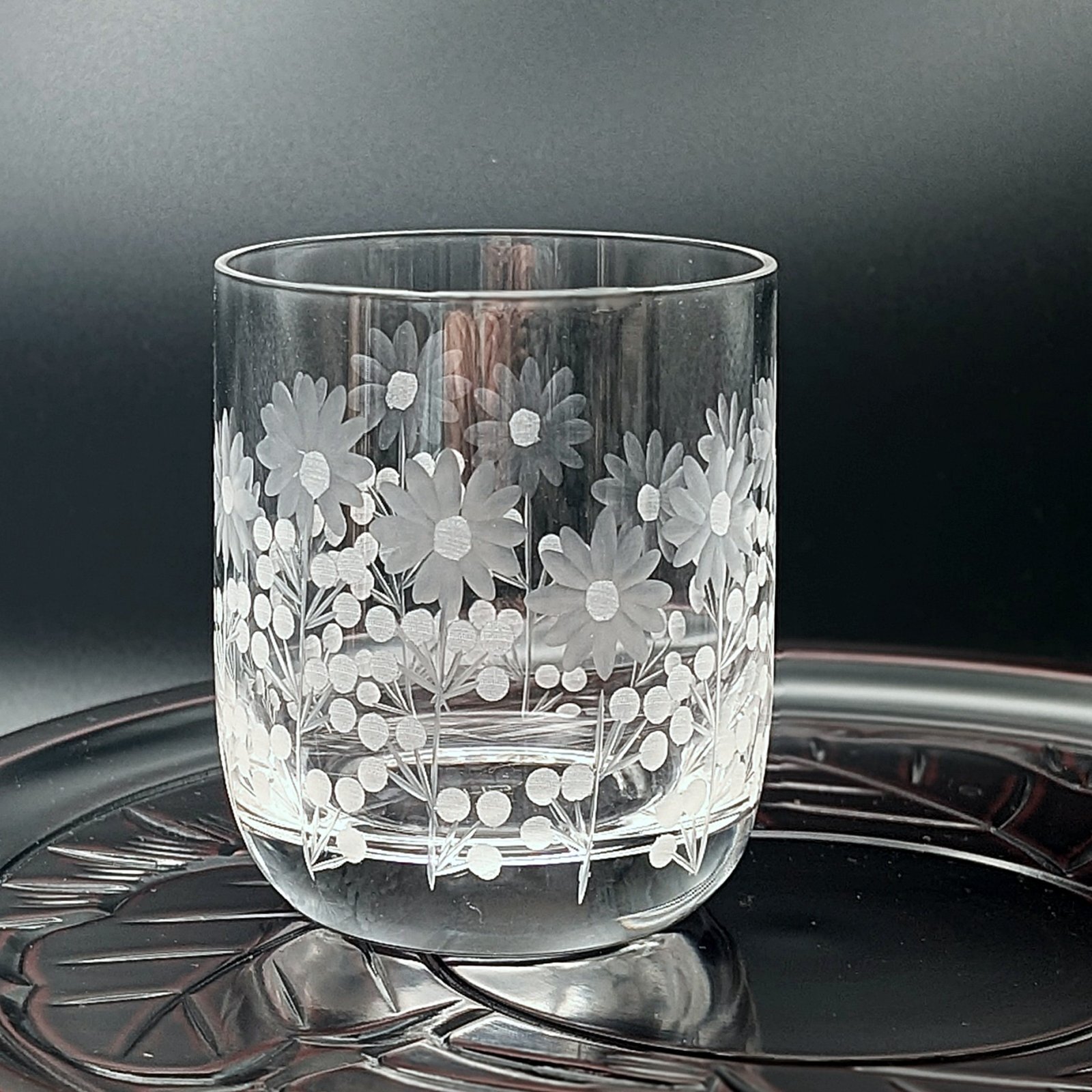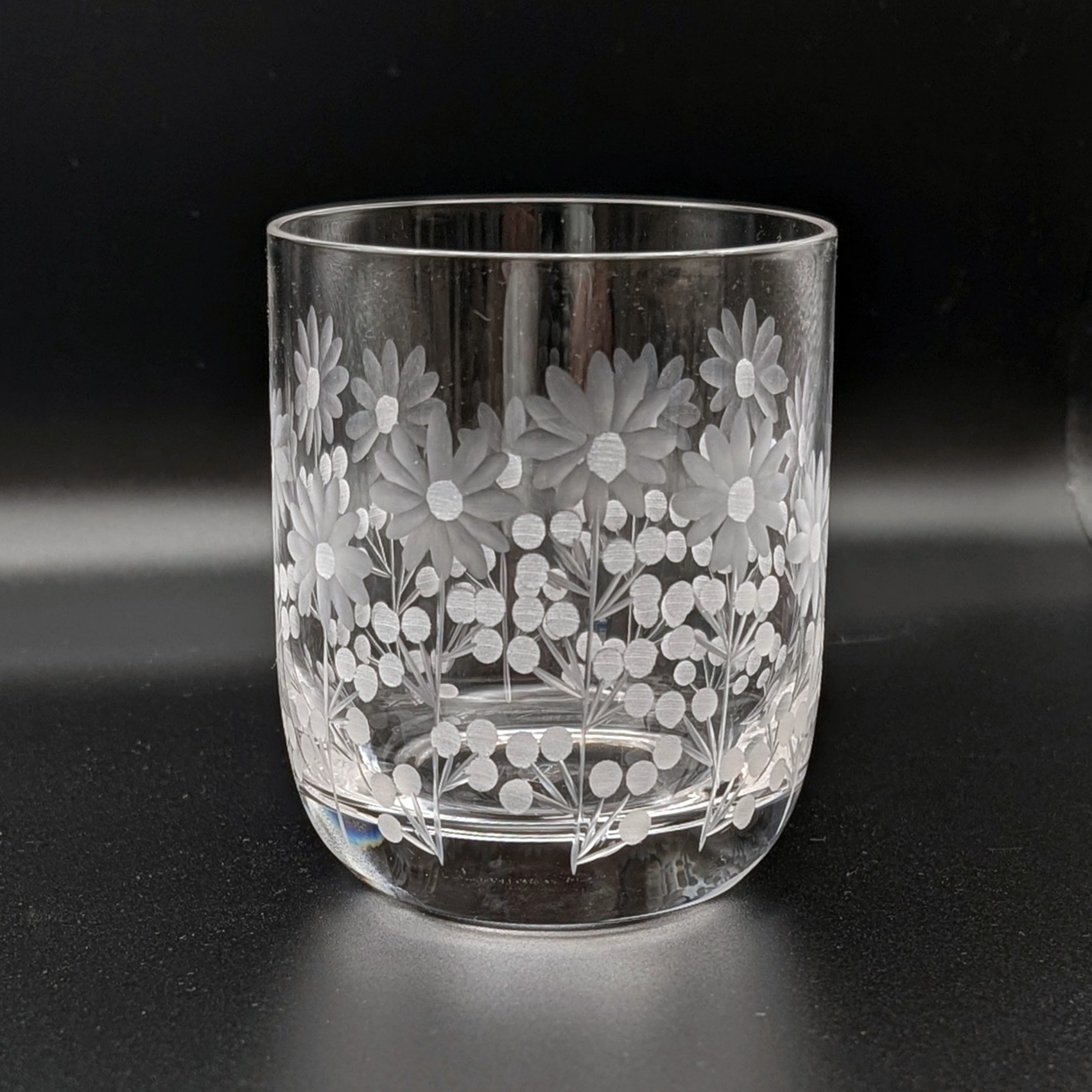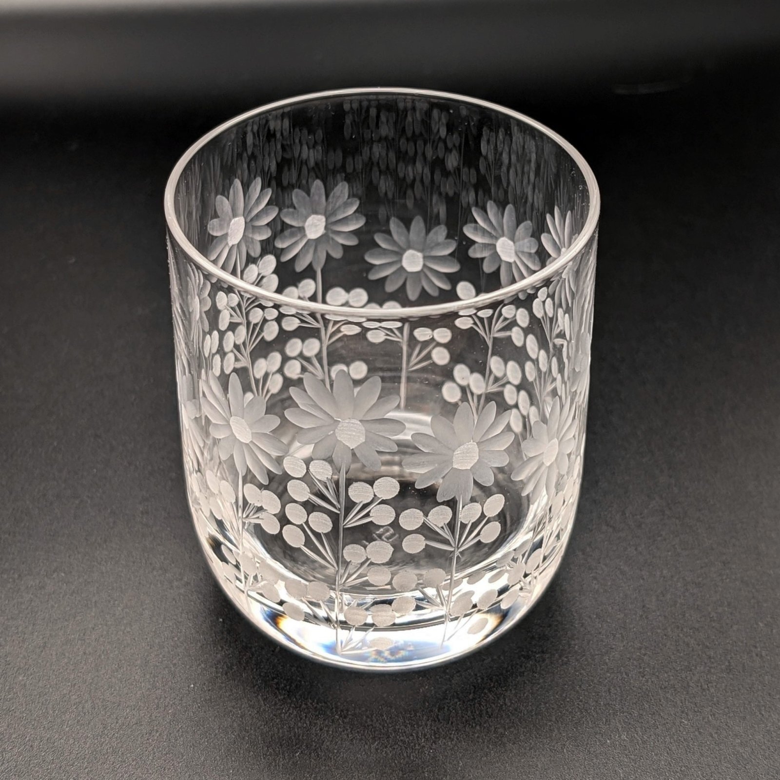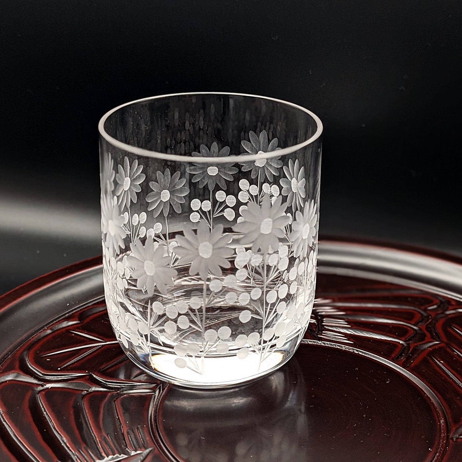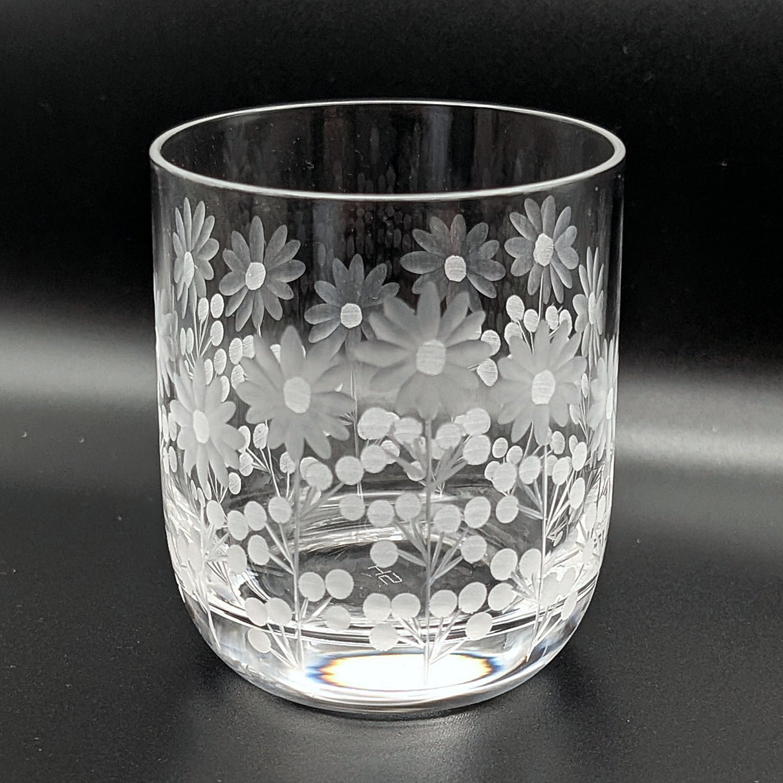 切子職人藤本さんの花模様の切子入りロックグラス かわいい花が全面に描かれた人気のポンポン花切子です。