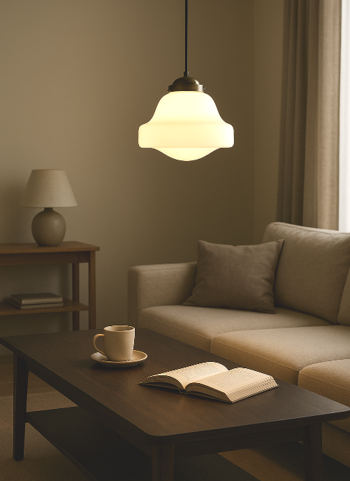 部屋の雰囲気に合わせやすい人気の型です。店舗にもよく使われています。やさしい光の乳白ガラス。